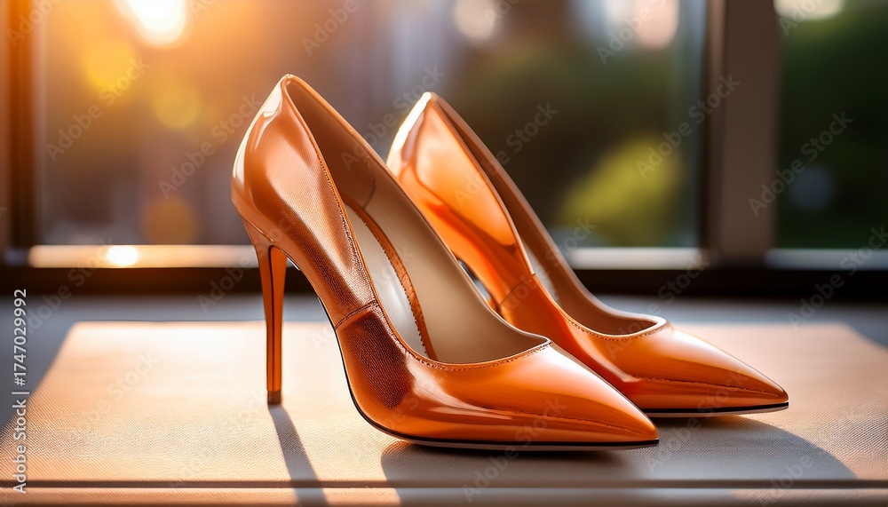 elegant shiny orange shoes sit in sunlight showcasing a modern chic design for sophisticated style and luxury footwear fashion #1747029992