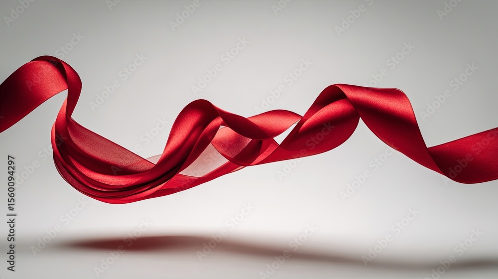 Elegant single red ribbon floating gracefully on a clean white background with soft directional lighting and minimalist aesthetic, perfect for themes of celebration, awareness, and simplicity.#1560094297