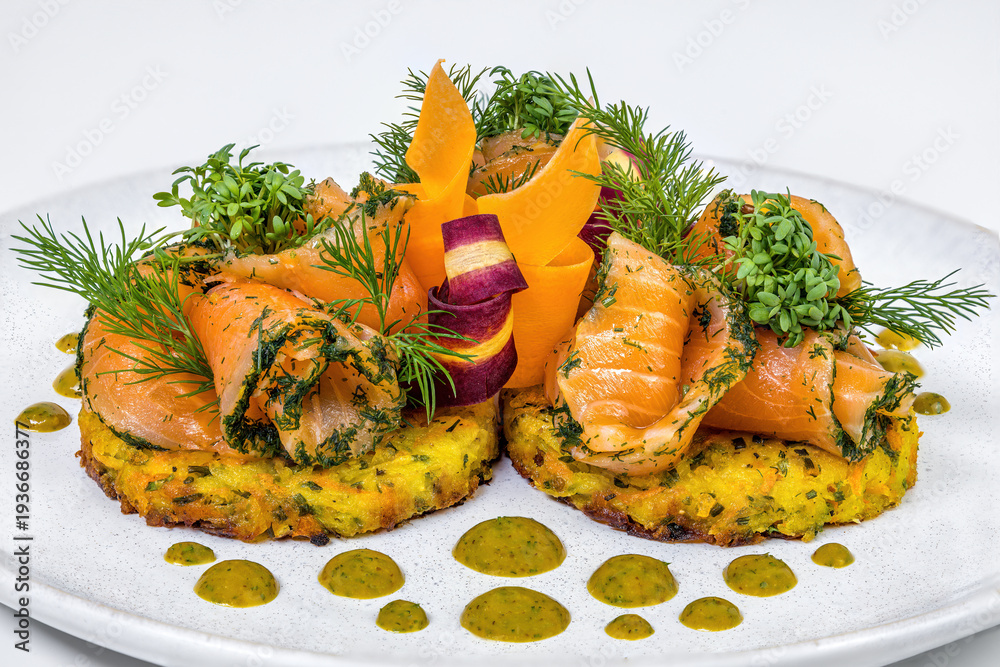 Elegant Smoked Salmon Rosettes on Crispy Potato Rösti with Herb Sauce #1936686377