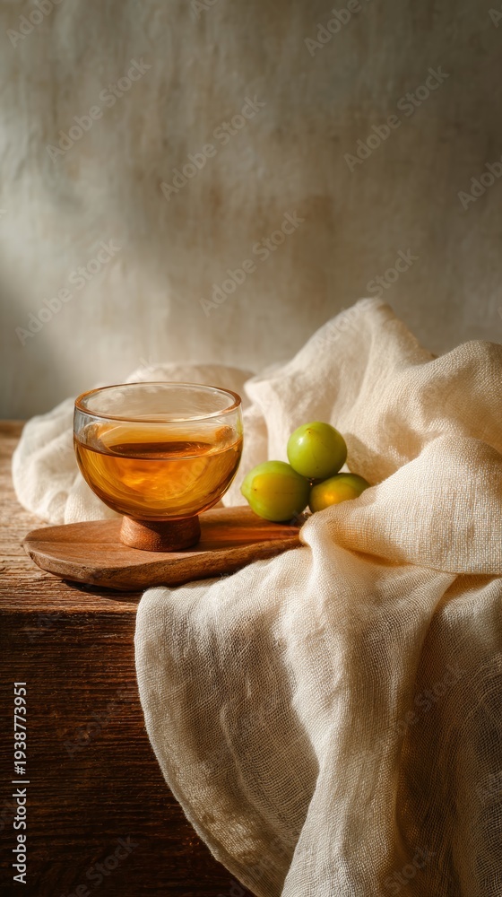 Elegant Still Life of Japanese Umeshu Plum Wine with Green Plums #1938773951