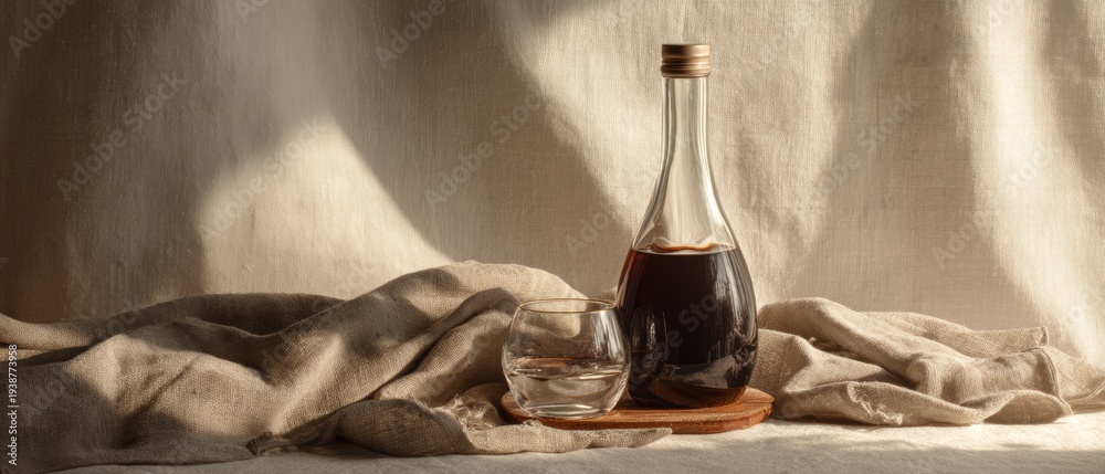 Elegant Still Life of Umeshu Bottle and Glass on Neutral Background #1938773958