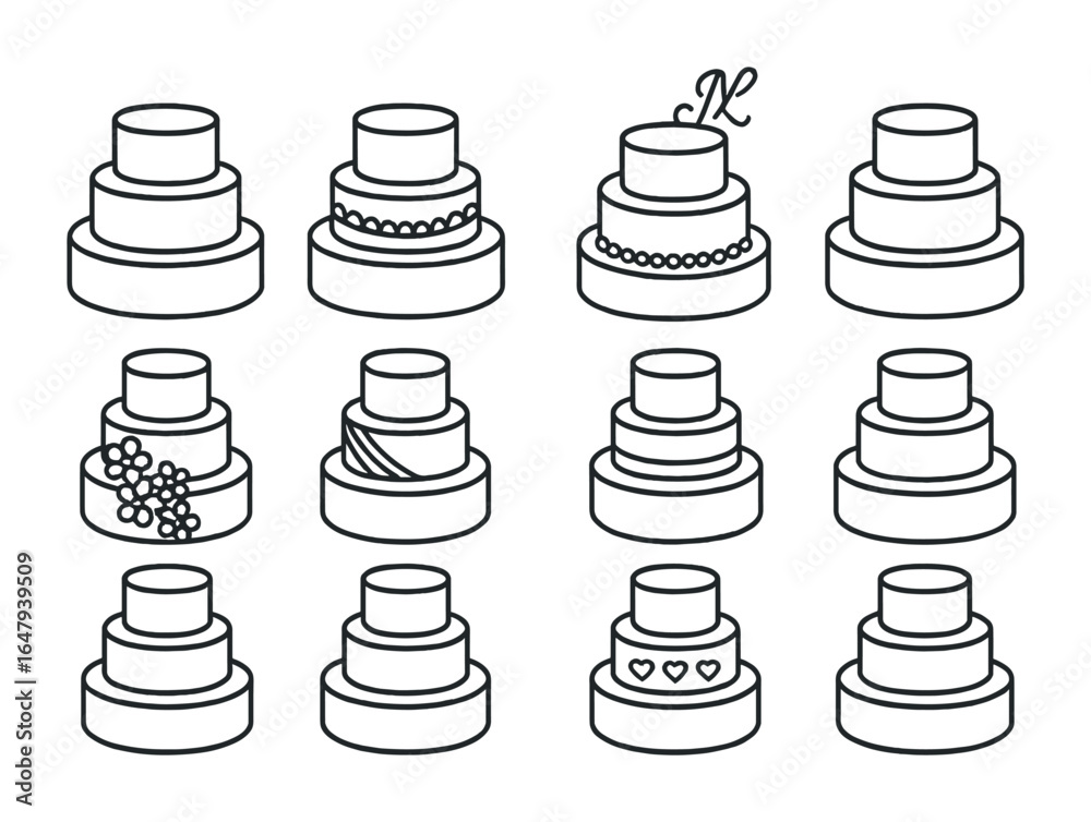 Elegant Wedding Cake Icons. Outline vector icons of wedding cake designs: three-tier cake, lace piping, pearl #1647939509