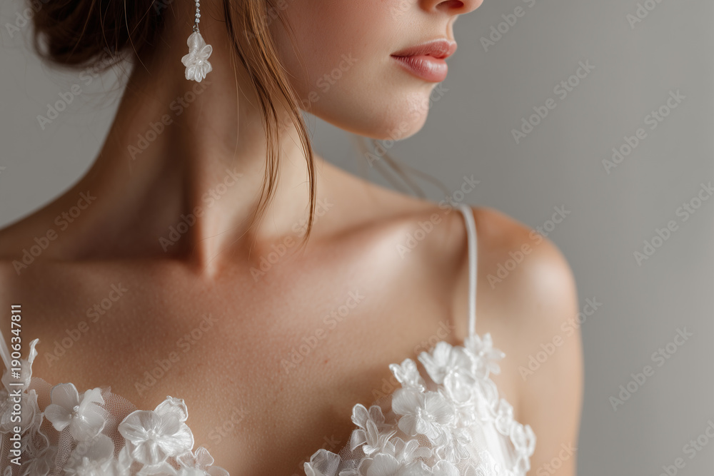 Elegant wedding dress with floral embroidery worn by a model in a soft setting #1906347811