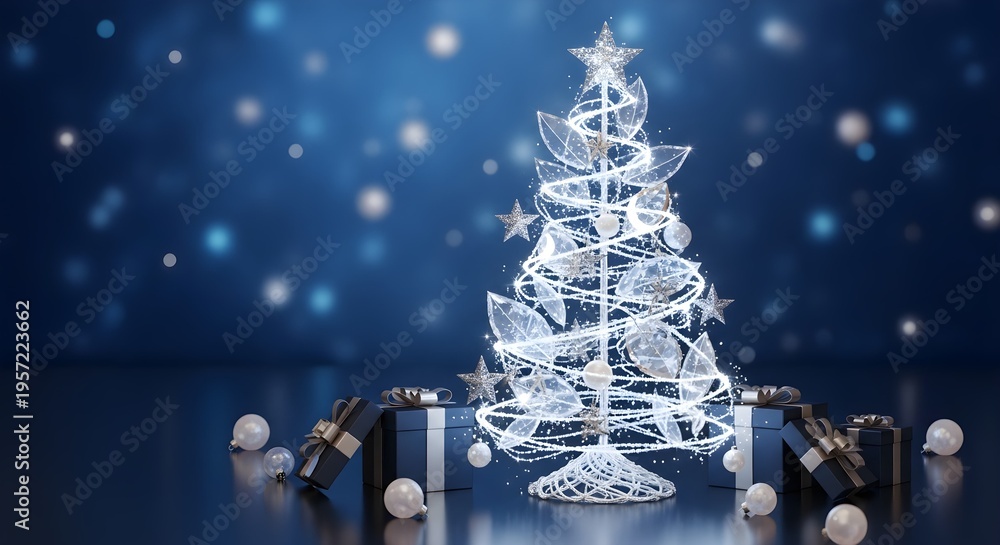 Elegant white Christmas tree with glowing lights on blue bokeh background, minimalist festive holiday scene with copy space for banner, greeting card, advertisement, winter celebration design #1957223662
