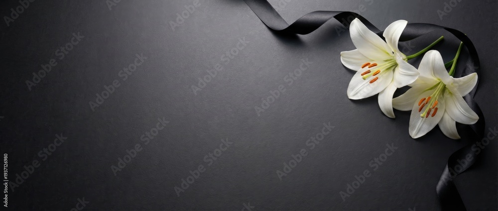 Elegant white lilies with black ribbon on dark background floral arrangement for events minimalist design studio setting focus on texture and contrast #1937126980