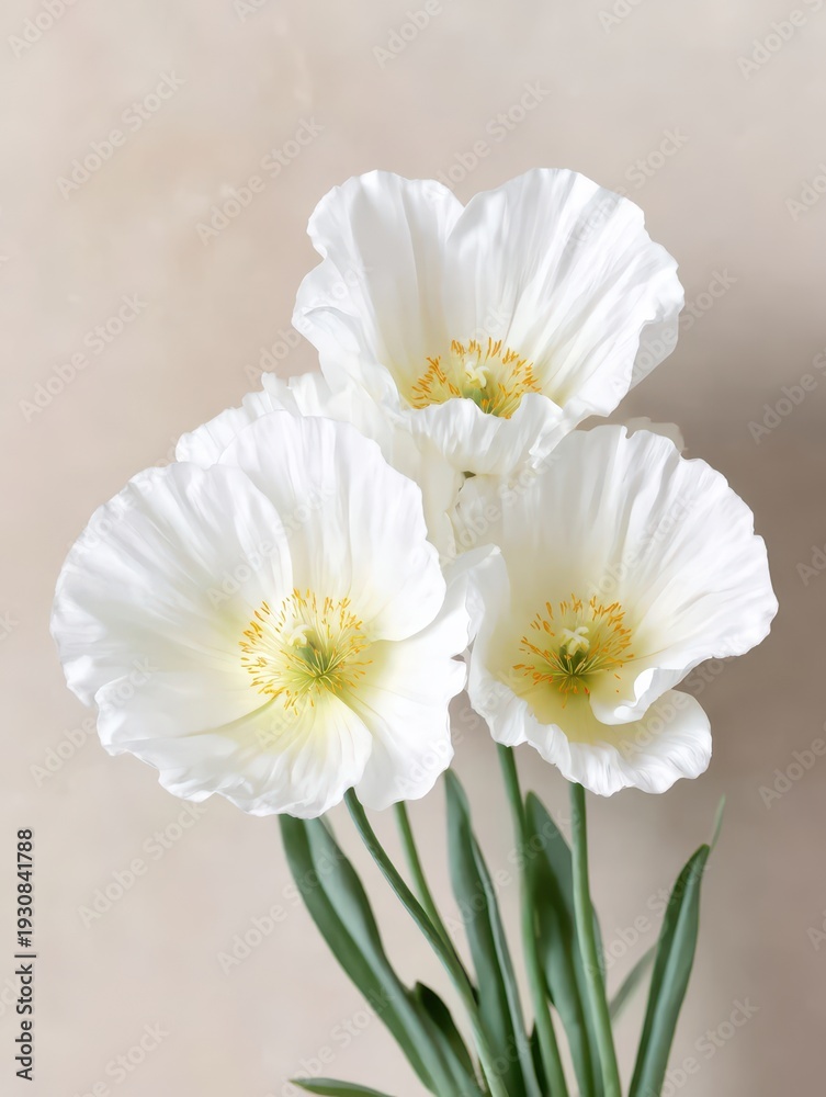 Elegant white poppy blossoms in soft neutral light with green stems #1930841788