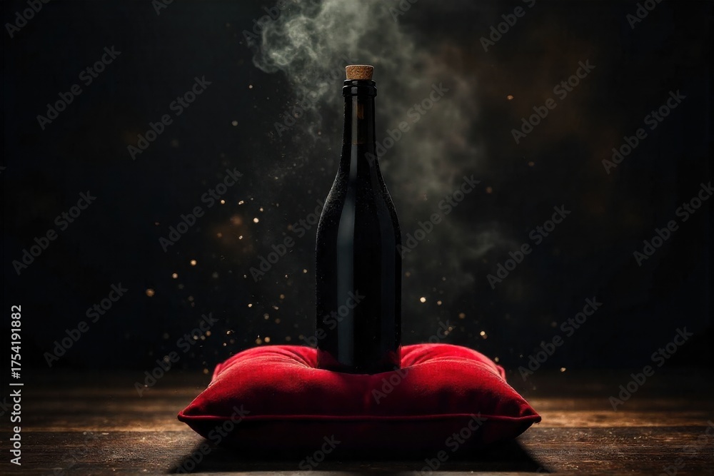 Elegant wine bottle resting on a velvet cushion in a dimly lit cellar, with subtle dust motes dancing in a single light beam. An elegant wine bottle resting on a rich, dark red velvet cushion in a #1754191882
