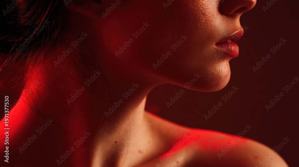 Elegant Woman Neck and Shoulder Profile Close-Up Illuminated by Deep Red Light Therapy Glow, Sensual Beauty Skin Care Wellness Treatment and Phototherapy Aesthetic Medicine Portrait #1971377530