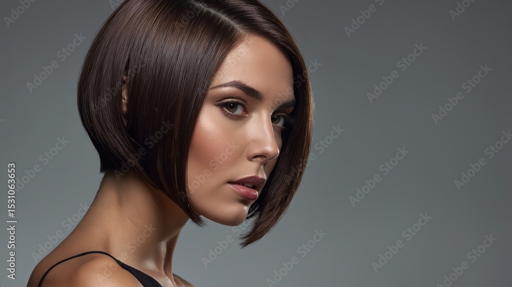 Elegante imagen de una modelo con un corte de pelo bob clásico, capturando su belleza natural y expresión tranquila. #1531063653