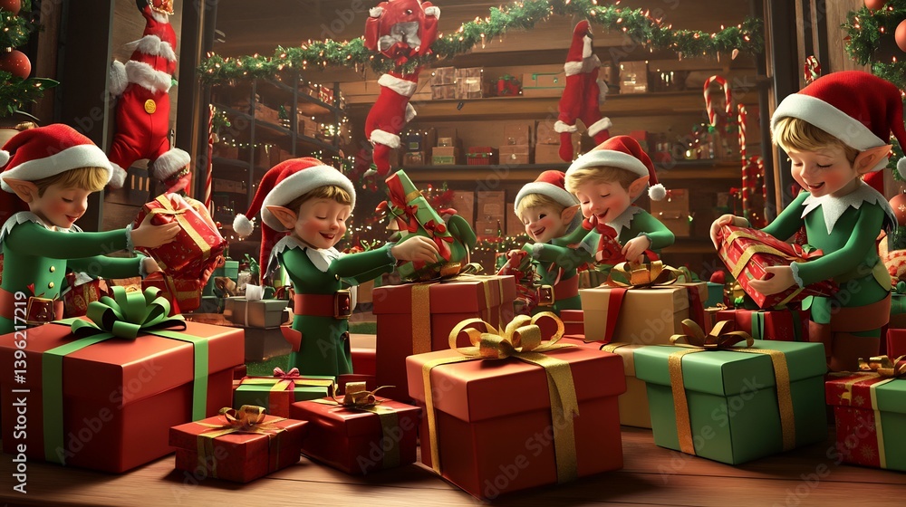 Elves wrapping presents Santas gift factory A fun and whimsical scene of hardworking elves wrapping gifts and tying ribbons #1396217219