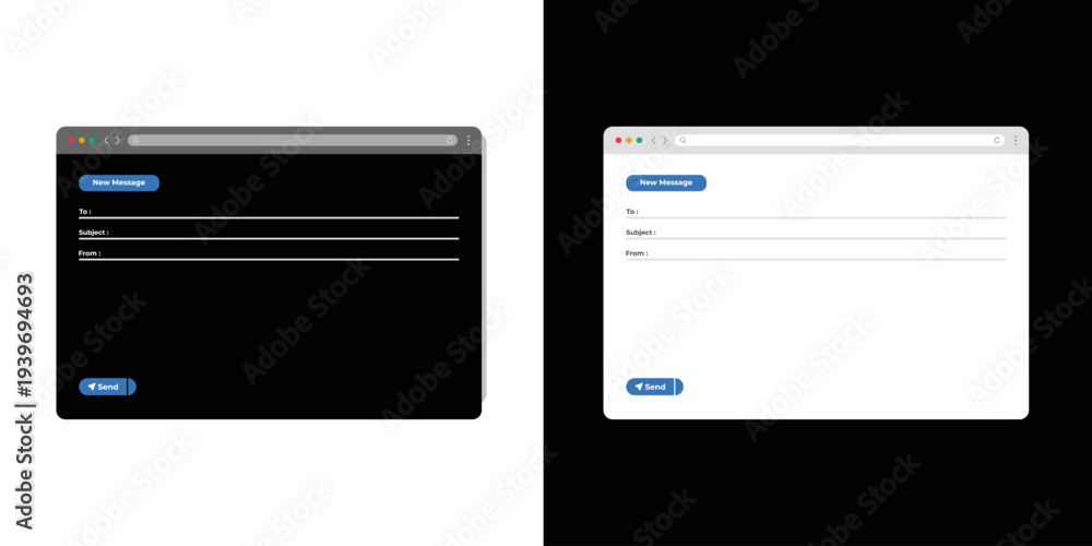 Email and messaging interface. Mail client new message window desktop user interface layout vector UI template illustration set. Light mode and dark mode #1939694693