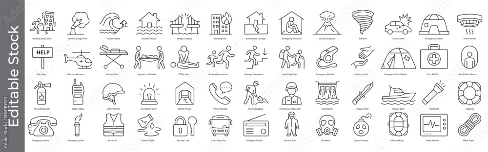 Emergency, disaster and rescue icon set – editable outline symbols of evacuation, shelter, accident, first aid, rescue and safety #1964189510