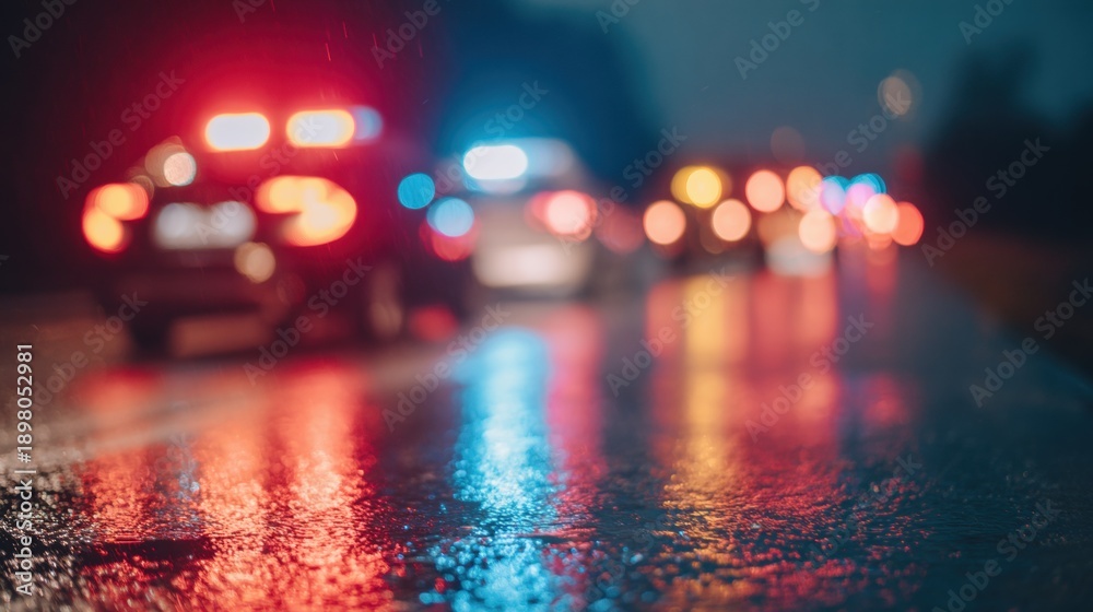 Emergency vehicles respond to an incident on a wet road at night #1898052981