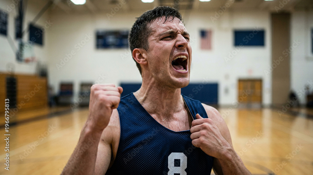 Emotional male athlete crying on a chair after a sports defeat, being comforted by supportive teammates in a crowded indoor arena #1966795813