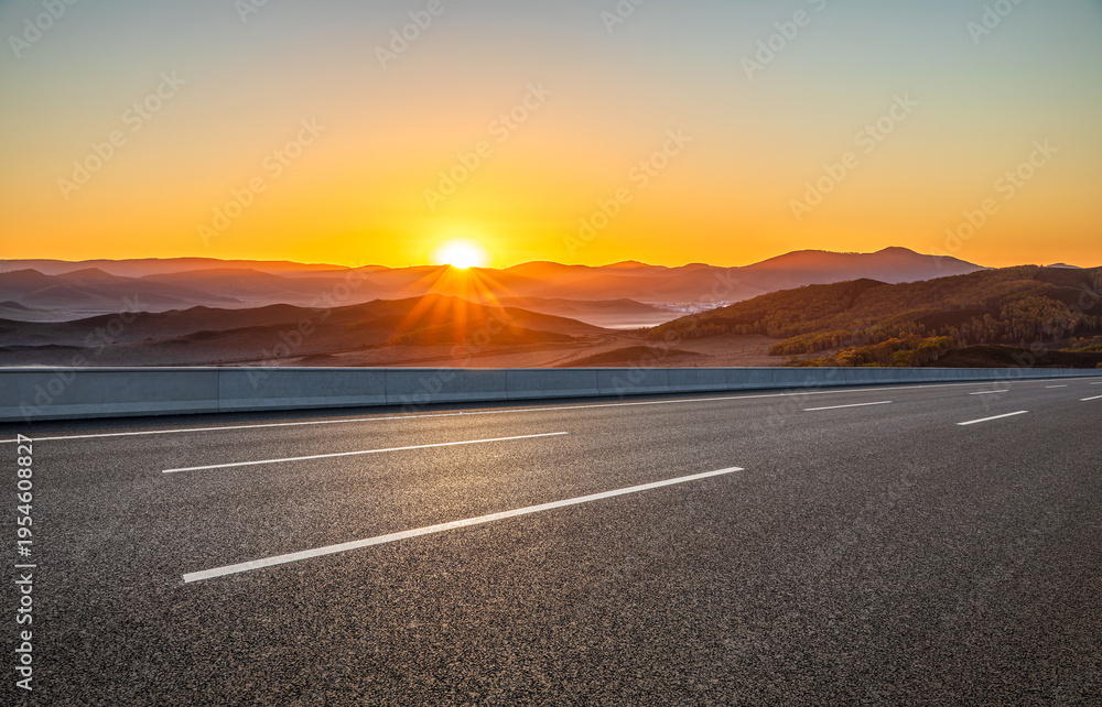 Empty asphalt highway through dramatic mountain landscape at sunrise, transportation and logistics concept, copy space. #1954608827