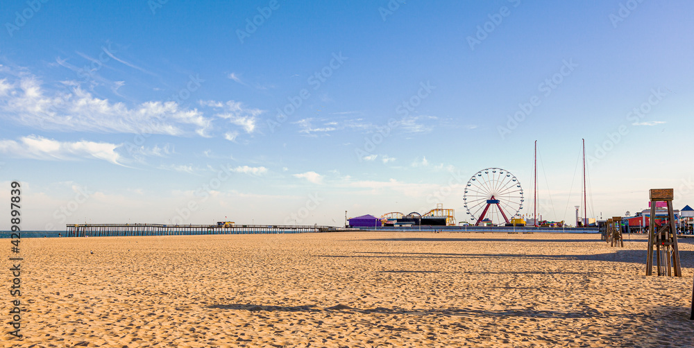 Empty beach of the popular tourist destination, Ocean City, Maryland. Image shows an afternoon view of the pier, board walk, shops, ferris wheel, lifeguard stands and the ocean at distance. #429897839