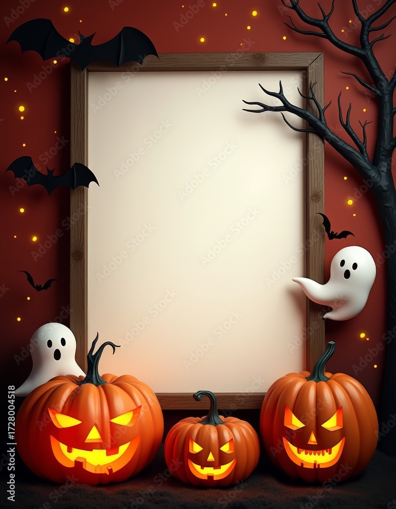 Empty Halloween picture frame on color background with bats ghosts and pumpkin border background spooky illustration decoration #1728004518