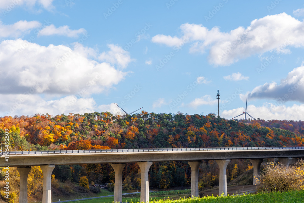 Empty highway bridge crossing an autumn valley with colorful forest, wind turbines, and a cell tower, symbolizing modern infrastructure, communication, logistics, and sustainable energy #1775492509