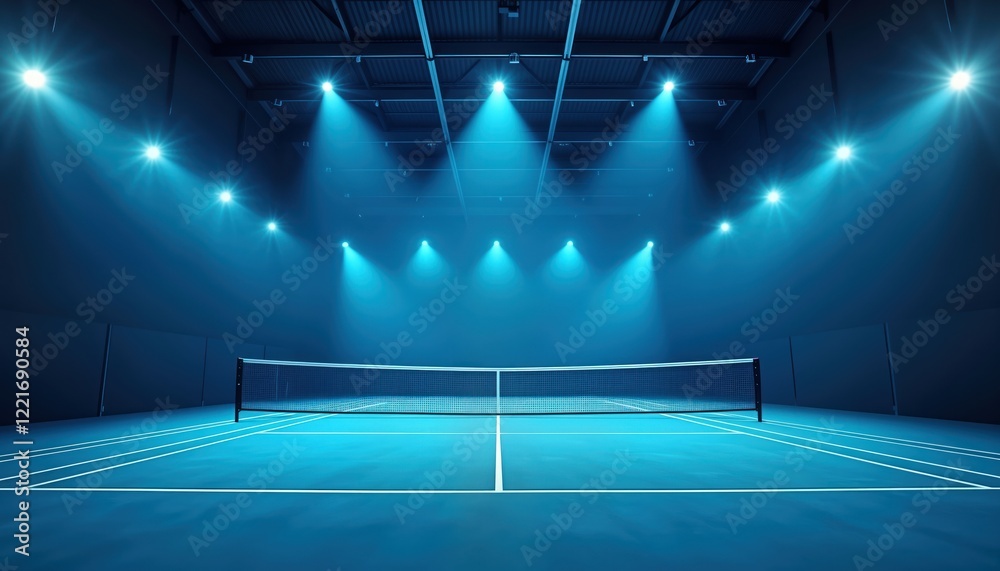 Empty indoor badminton court lit by blue lights. Modern design, organized space. Anticipation of activity. Clean, illuminated arena. Pro sport setting. Modern sport facility. Geometric layout. Great #1221690584