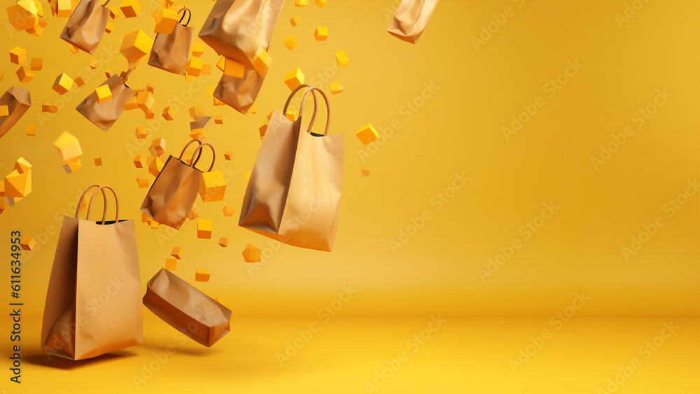 Empty orange color shopping bag on the yellow background, copy space text, Design creative concept for autumn sale event. generative ai. #611634953
