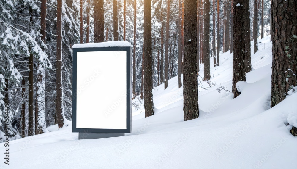 Empty poster in forest at winter. blank mockup advertising banner in ski resort snow. Advertise promotion board amidst woodland during cold season. display area for message wintertime. #1755447325