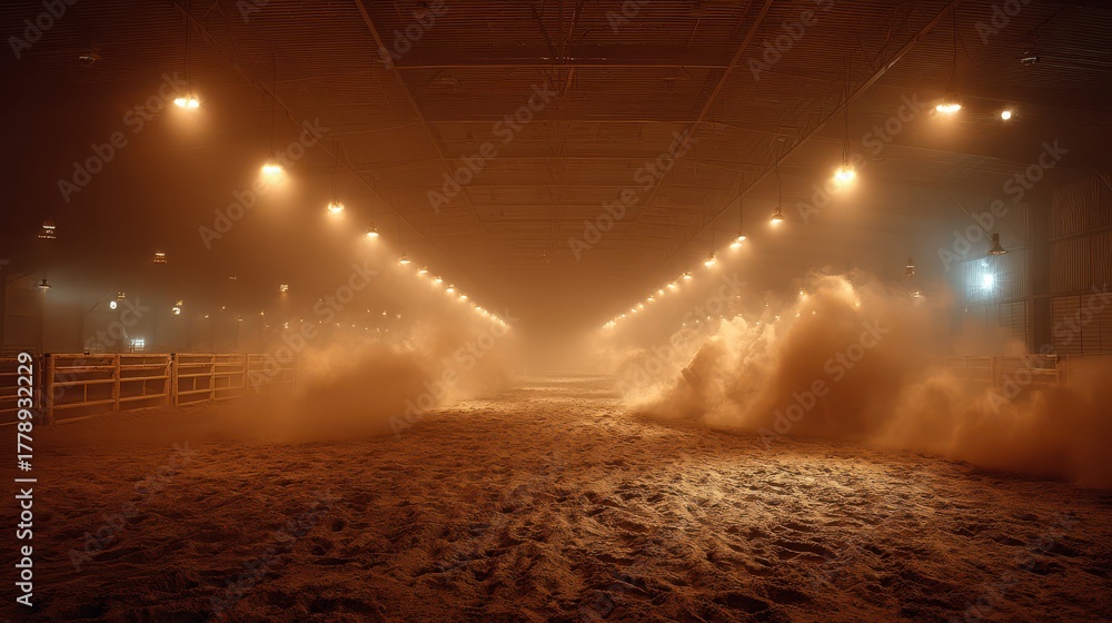 Empty rodeo arena with dust and dramatic lighting creating a sense of anticipation and excitement for the event #1778932229