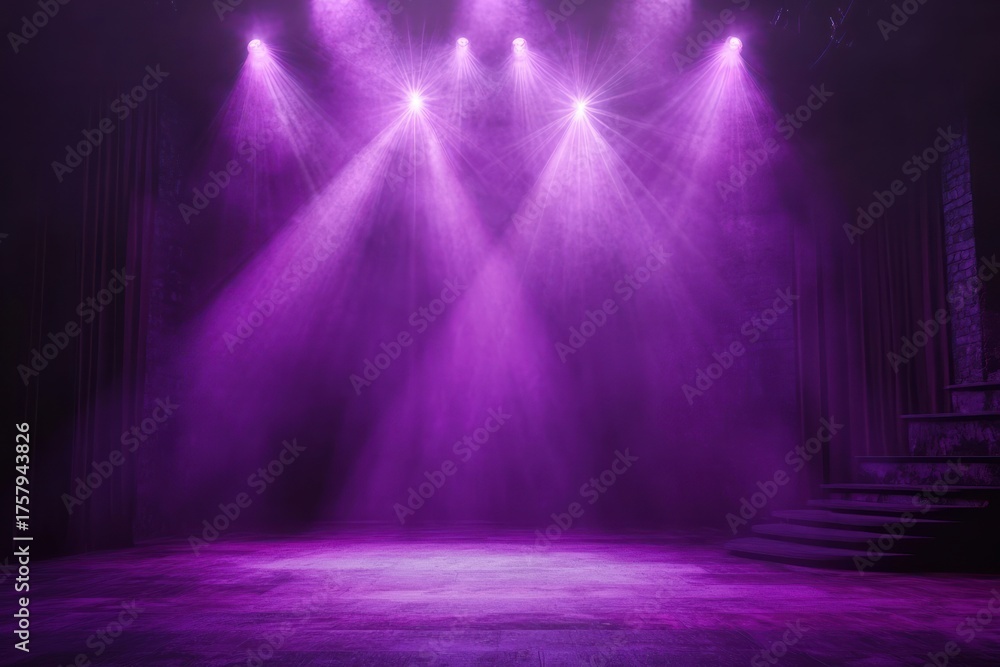 Empty stage illuminated by multiple purple spotlights creating a dramatic and mysterious atmosphere with visible stairs and curtains on the sides #1757943826