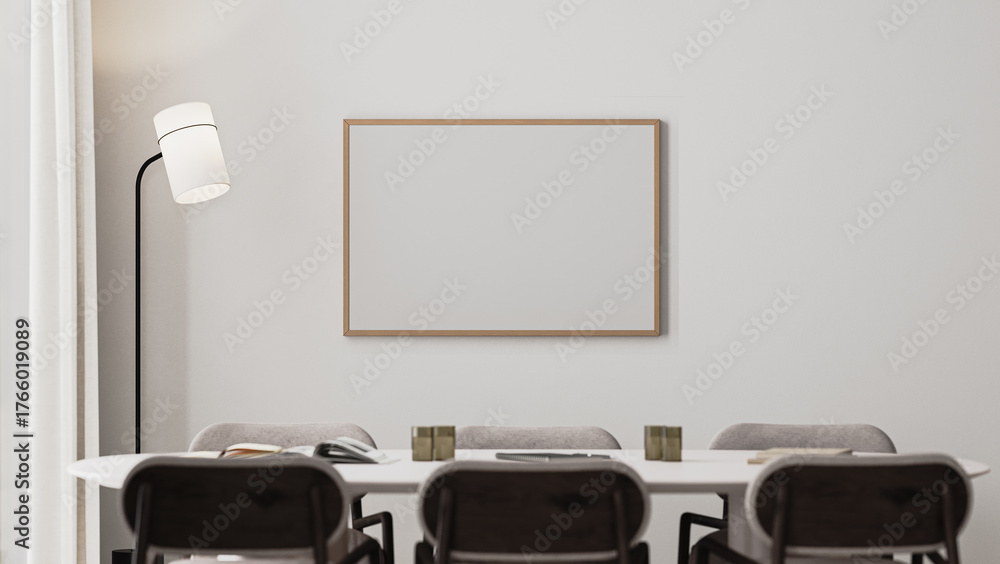 empty wooden picture frame mock-up in meeting room interior with long desk,modern chairs and floor lamp, 3d render #1766019089