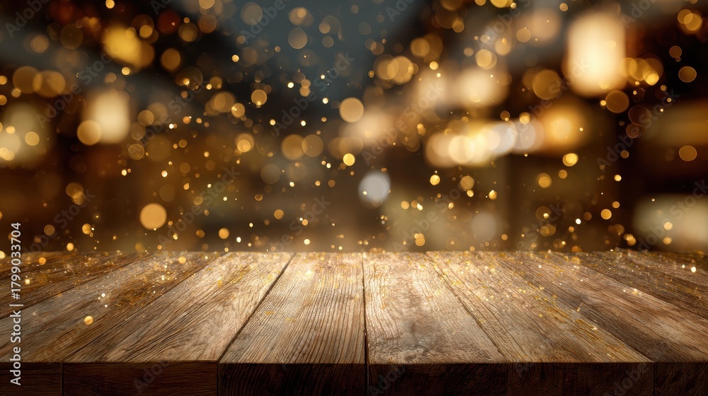 empty wooden table top with warm golden bokeh lights and soft sparkling particles in festive holiday atmosphere concept of christmas new year celebration and seasonal decoration #1799033704