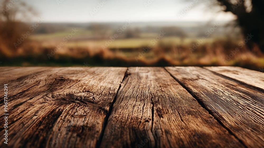 Empty wooden tabletop as the main subject showcasing natural grain and rustic character, softly blurred countryside-inspired background, warm diffused lighting enhancing organic tones, eye-level shot #1967746291