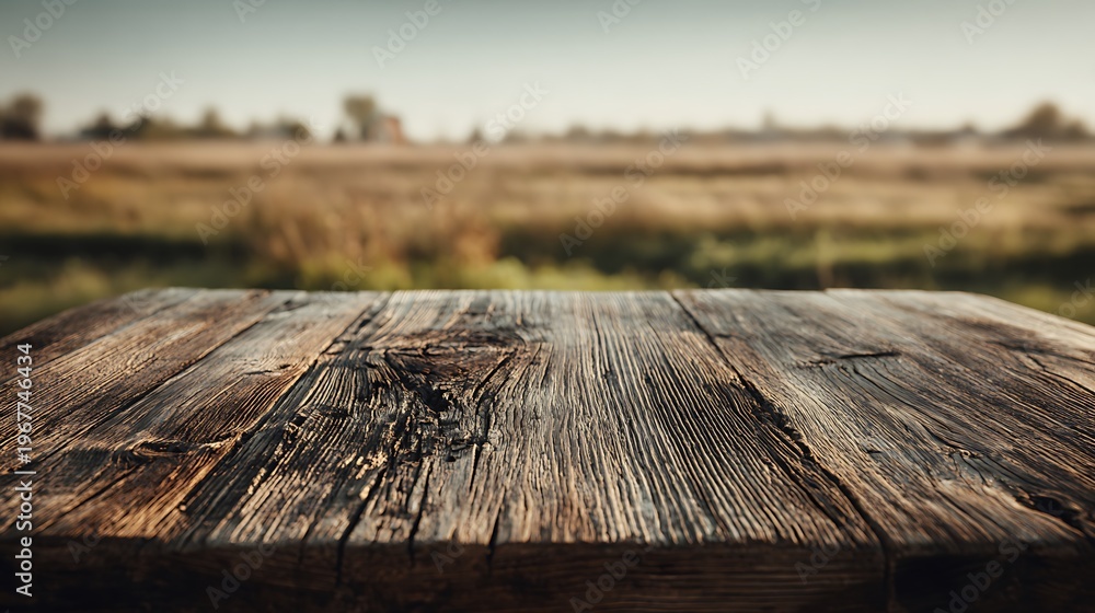 Empty wooden tabletop as the main subject showcasing natural grain and rustic character, softly blurred countryside-inspired background, warm diffused lighting enhancing organic tones, eye-level shot #1967746434