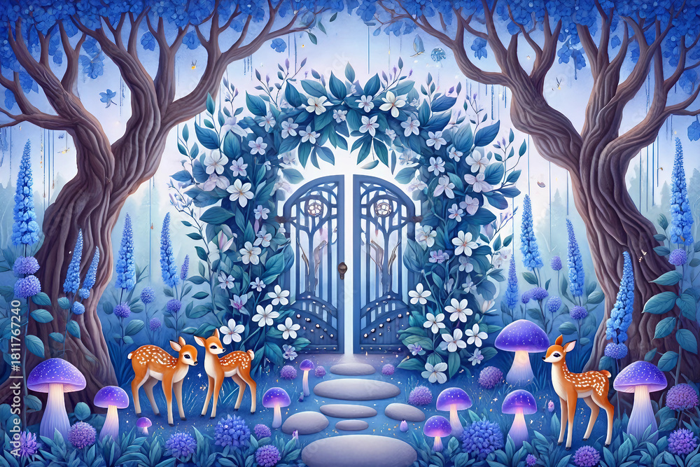 Enchanted fantasy garden with blue flowers, glowing mushrooms and magical gate, creating a dreamy fairy tale atmosphere. #1811767240