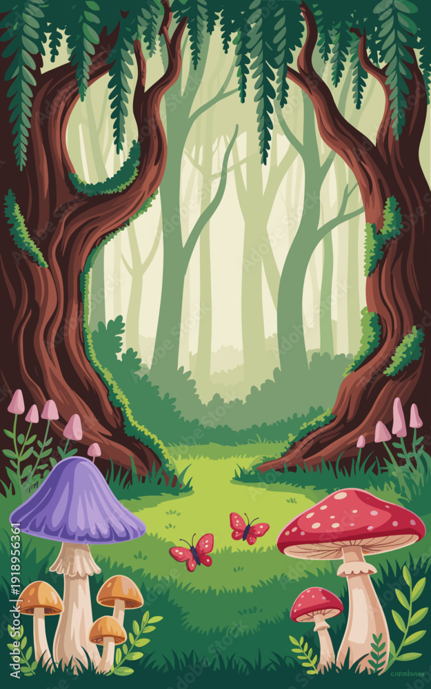 Enchanted Forest Glade Illustration with Mushrooms, Butterflies and Dreamy Atmosphere, Perfect for Children's Books, Fantasy Games, Magical Environments and Nature-Themed Designs, Cartoon Style, Peace #1918956361