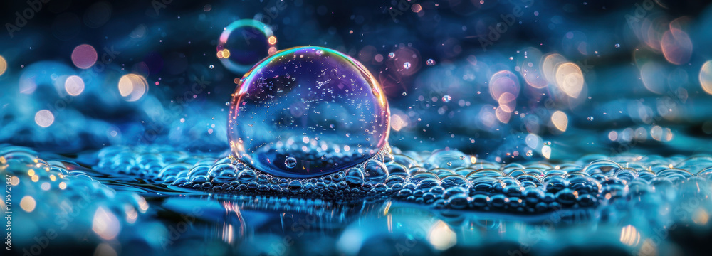 Enchanted Soap Bubble: A single soap bubble, reflecting a spectrum of colors, rests upon a textured surface. The image exudes an ethereal atmosphere #1795721437