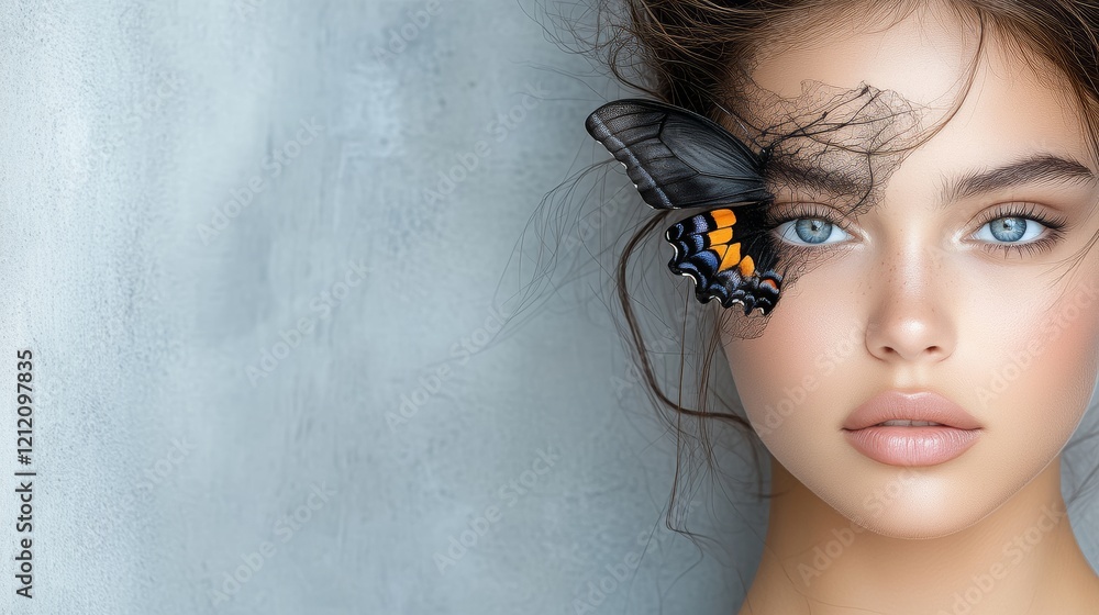 Enchanting Carnival Moments: A Woman Captivated by a Beautiful Butterfly Gracefully Perched on Her Face, Symbolizing Transformation and Joy #1212097835