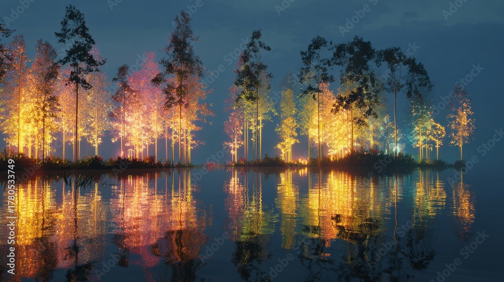 Enchanting digital landscape with glowing water reflections and vibrant trees in a serene setting #1780533749