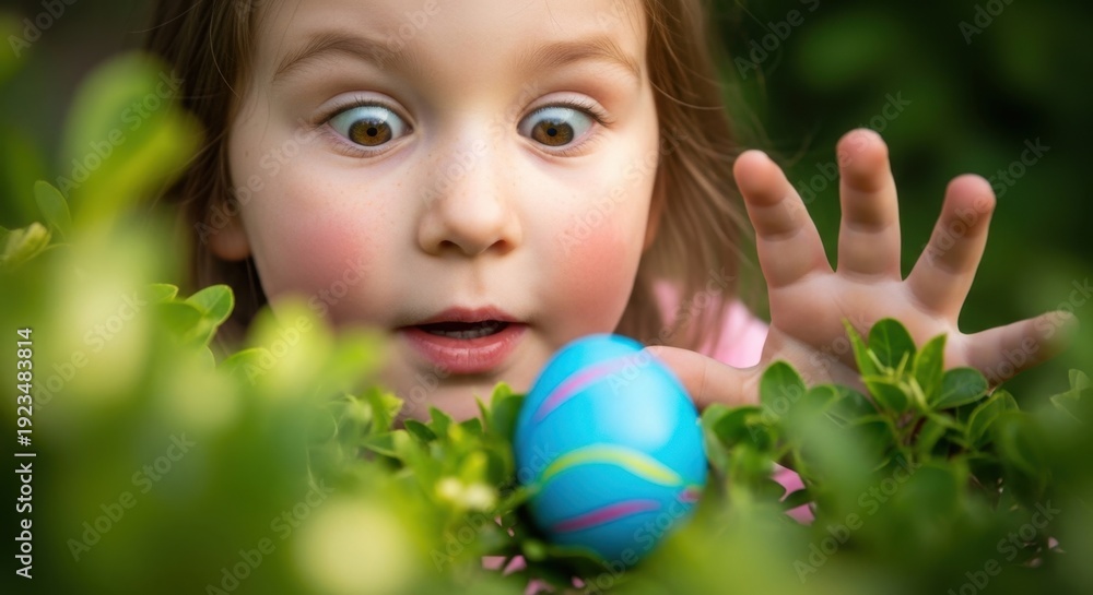 Enchanting Discovery: A young girl's eyes widen with pure amazement as she beholds a vibrant blue easter egg amidst lush greenery, a moment of childhood wonder captured in exquisite detail. #1923483814