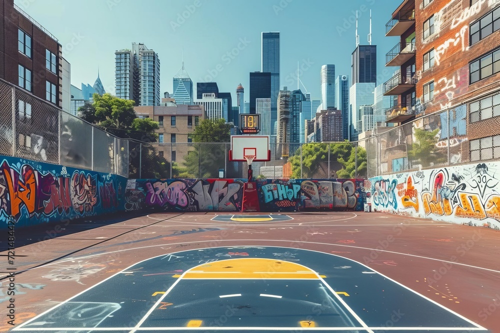 Energetic urban basketball court with graffiti and skyline backdrop #721484423