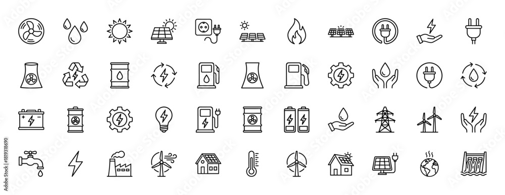 Energy and ecology line icon set. Vector pictograms of solar panels, wind turbines, power plants, batteries, electric plugs, and environmental elements, thin linear illustration. #1819318690