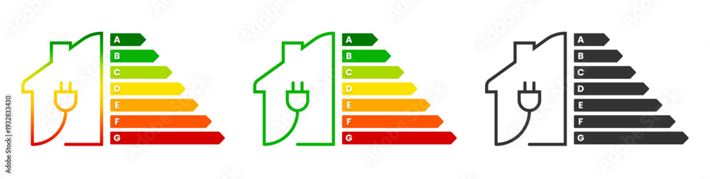 Energy efficiency home rating label signs. Isolated efficient house or flat renovation class symbols on white background. Building ecological certification icons for real estate. Vector illustration. #1932833430