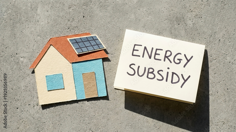Energy subsidy concept with paper house model featuring solar panel and handwritten note on concrete surface, symbolizing renewable energy support and financial aid #1925356989