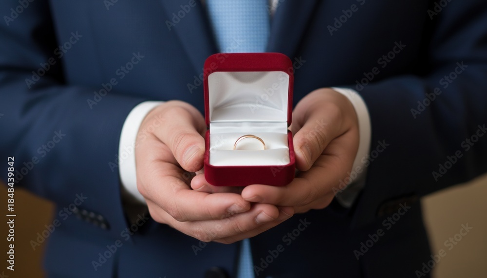 Engagement ring in red box held by man in suit studio, close-up hands presenting diamond jewelry, romantic marriage proposal concept, love commitment and wedding symbolism #1848439842