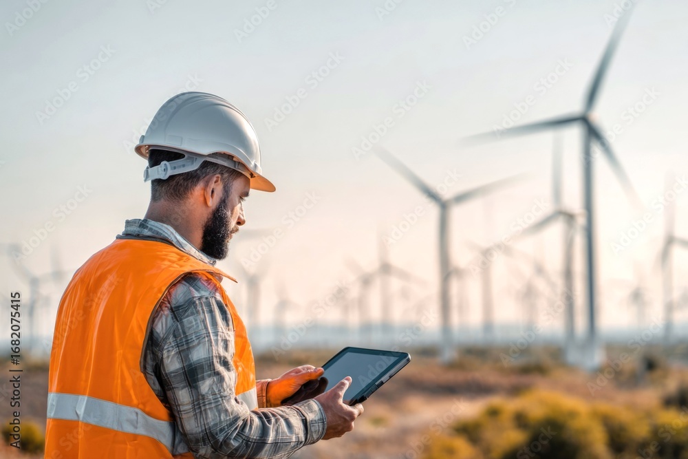 Engineer in hard hat and orange vest holds digital tablet in hands against wind power plant on sunny day. Concept of modern technologies at work, generating eco-friendly electricity, wind farm #1682075415