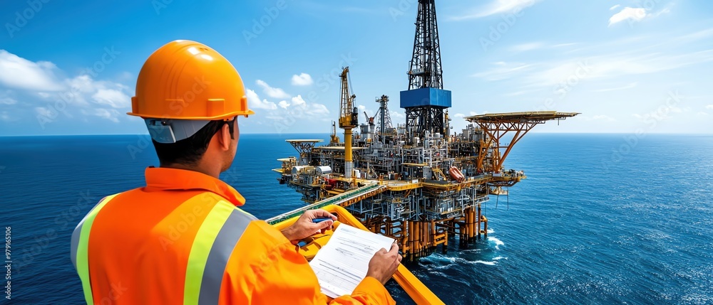 Engineer in orange gear inspects offshore oil platform in the ocean, focusing on safety and operations under clear skies. #979165106