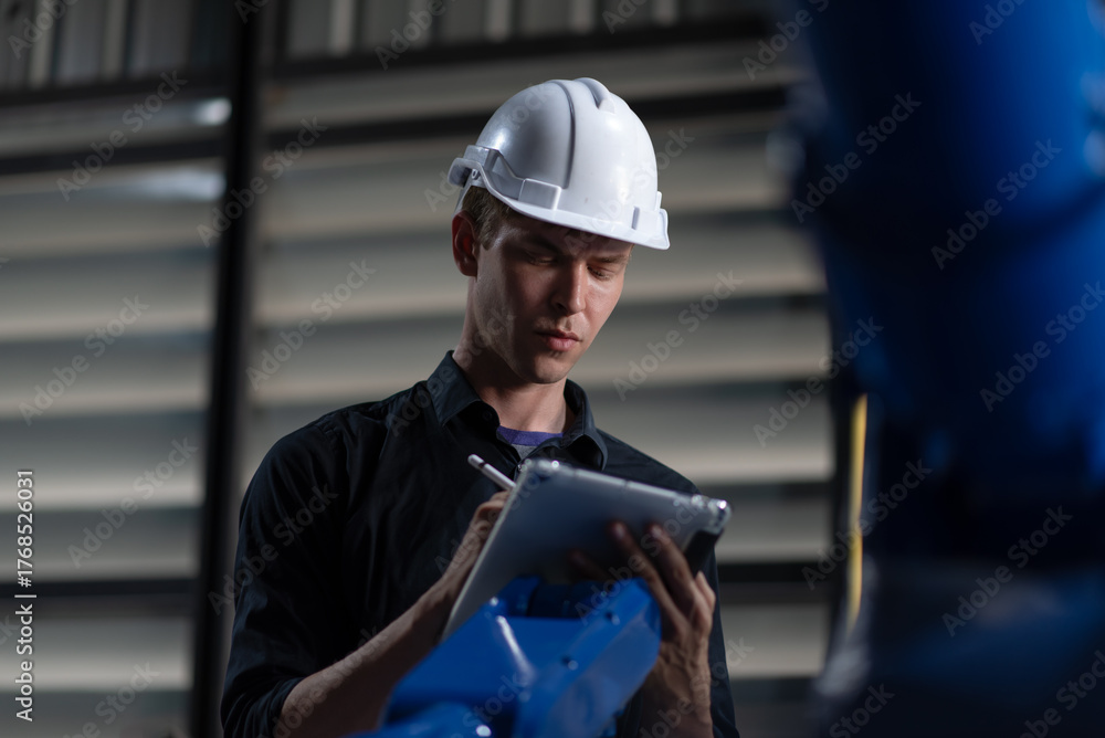 Engineer standing by robotic arm and operating machine in industry factory, technician worker check for repair maintenance electronic operation #1768526031