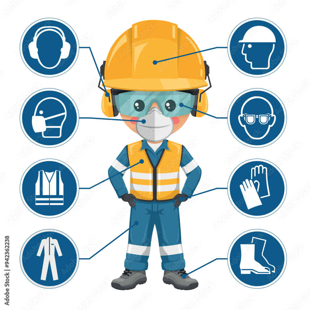 Engineer with personal protective equipment and icons, safety pictograms. Helmet, vest, glasses, gloves, footwear, coverall, ear protection, mask. Industrial safety and occupational health at work #942362238