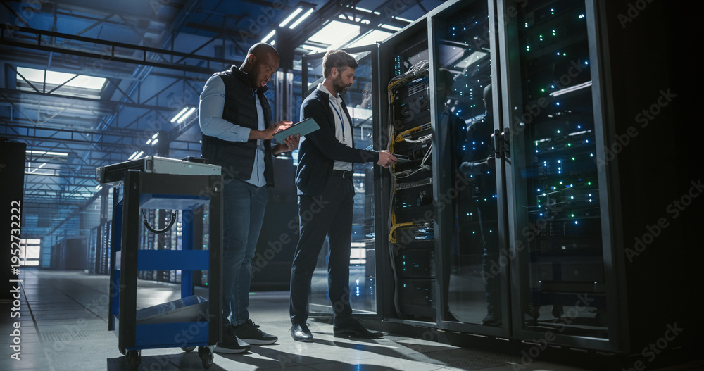 Engineers collaborate in a high-tech data center, using a tablet to analyze server rack performance, inspect network cables, verify device connections, business infrastructure, and it service systems #1952732222