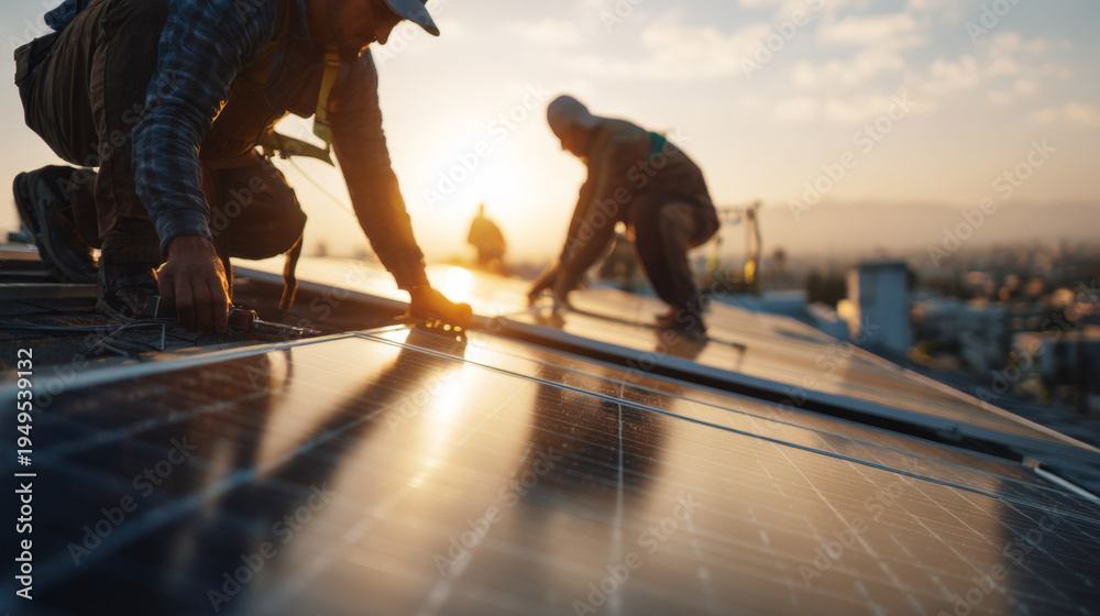 Engineers Installing Solar Panels on Residential House Roof #1949539132