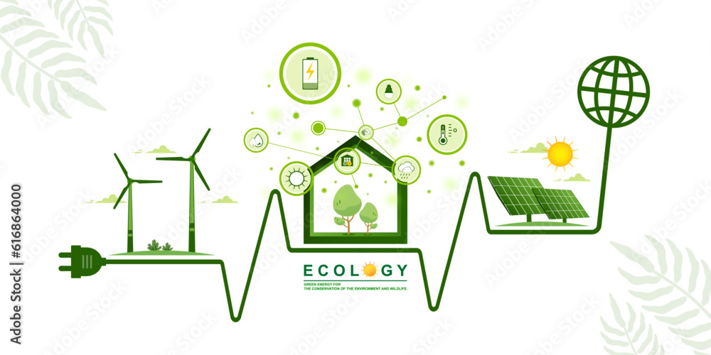Environmental care and use clean energy from renewable sources concept, Infographic of smart modern eco house or home with windmills farm, Wind power, Solar energy panel, Sustainable of green ecology. #616864000