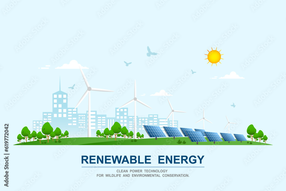 Environmental care and use clean green energy from renewable sources and low carbon concept, Wind power generators or Turbine farm and Solar cells panels, Power generation industry on city background. #619772042